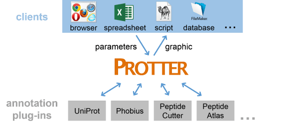 The ProtterServer is a webservice to visualize the sequence, topology and annotations of individual proteins. The server is written in Java. The webserver functionality is based on NanoHTTPD (version 1.21). For visualization a request is transformed into a TeX file which is processed within a LaTeX distribution (e.g. MiKTeX) by the TeXtopo package. Textopo takes care of the layout of protein topology. The resulting dvi file is converted to a svg file using dvisvgm. The initial svg is further processed to include the specified styles. Optionally, the resulting svg may be converted to a png or pdf image using the Apache Batik toolkit. To allow for visualization of annotations ProtterServer is using several other webservices to resolve sequence specific protein annotations. Currently UniProt, Phobius and PeptideCutter can provide sequences and annotations.