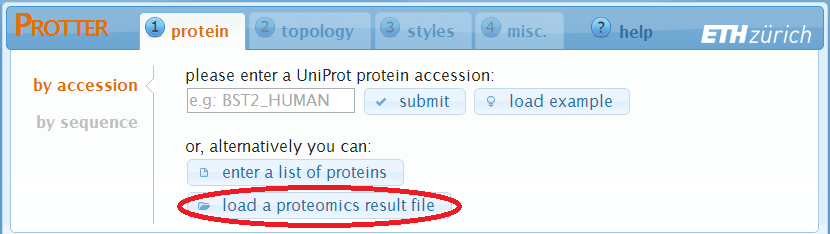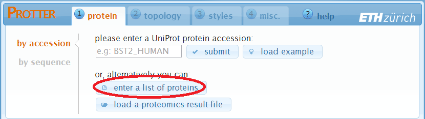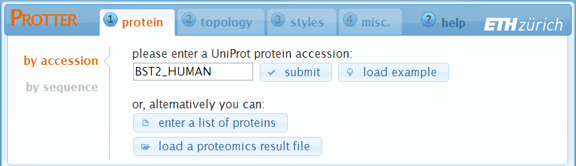 You start at the "protein" settings where you specify the protein that you want to visualize. Just enter the UniProt protein identifier of your protein. You can also provide gene names and Protter will ask you back in case that this gene name is ambiguous within UniProt.