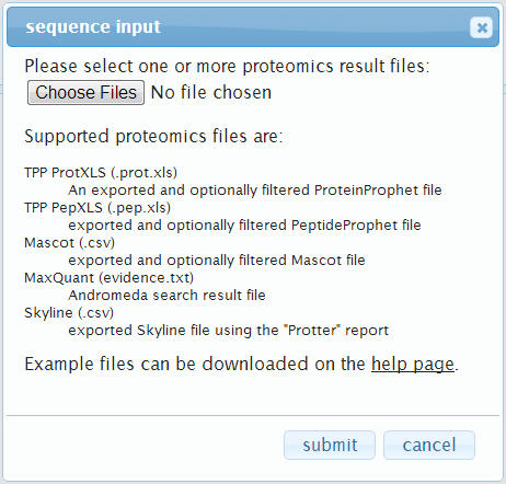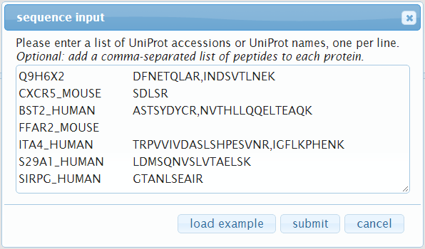 Optionally, you can also specify a list of peptides per protein: add a space or tab after the protein accession and then a comma-separated list of peptide sequences.