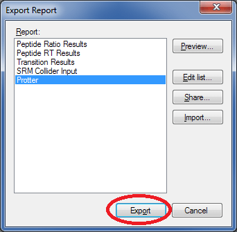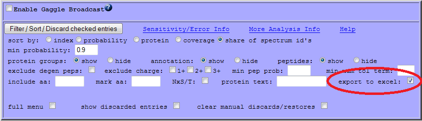 First, in the ProteinProphet web-interface, filter the list of proteins as desired (e.g. by probability).