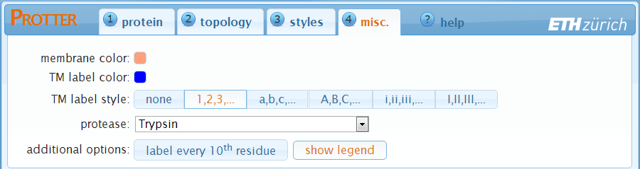 Specification of the protein's sequence has generated a first visualization using default parameters. In the "topology" settings, you can fine tune the protein's topology.
