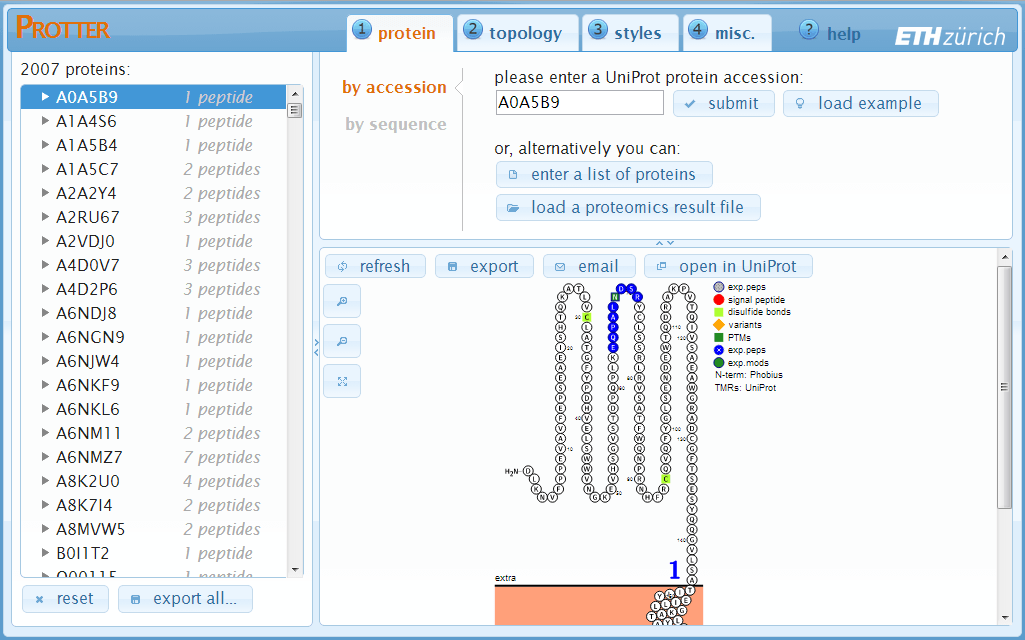 By clicking a protein, Protter will immediately load the selected protein in the visualization pane. Additionally, if specified, the list of peptides of this protein will be shown.