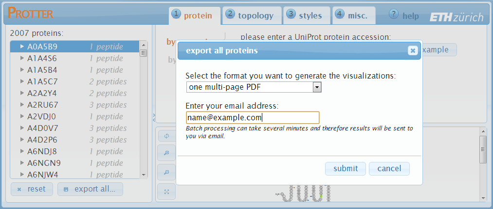 On top of visualizing your protein of interest you can also load a list of proteins, browse through the visualizations, and download a combined visualization of all proteins as one PDF document or as ZIP archive of separate files. This is particularly useful to visualize results of mass-spectrometry based proteomics studies.