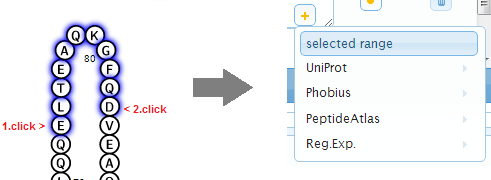 Clicking a peptide sequence will select (see Visualization section) the corresponding region on the amino acid sequence in the protein visualization: