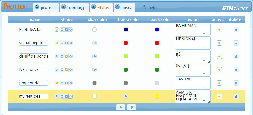 In Protter, Styles are used to highlight certain regions of the protein sequence by varying four parameters: