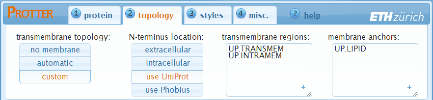Note: if tm=auto transmembrane topology will be automatically determined, which is equivalent to nterm=UP.NTERM&tm=UP.TRANSMEM&anchor=UP.LIPID for a UniProt identifier